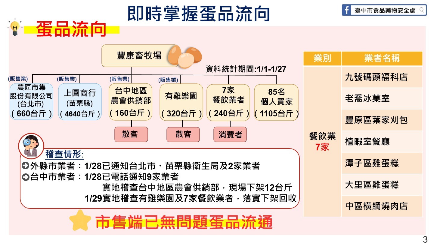 台中市衛生局已通知11家業者全數下架,並完成台中市9家業者實地稽查,確認已無案場蛋品在市面流通販售。此外,為維護消費者權益,已責令案場設置專責客服專線辦理退費事宜,且須每日回報回收進度。截至1月29日中午,已回收約17.51台斤。
