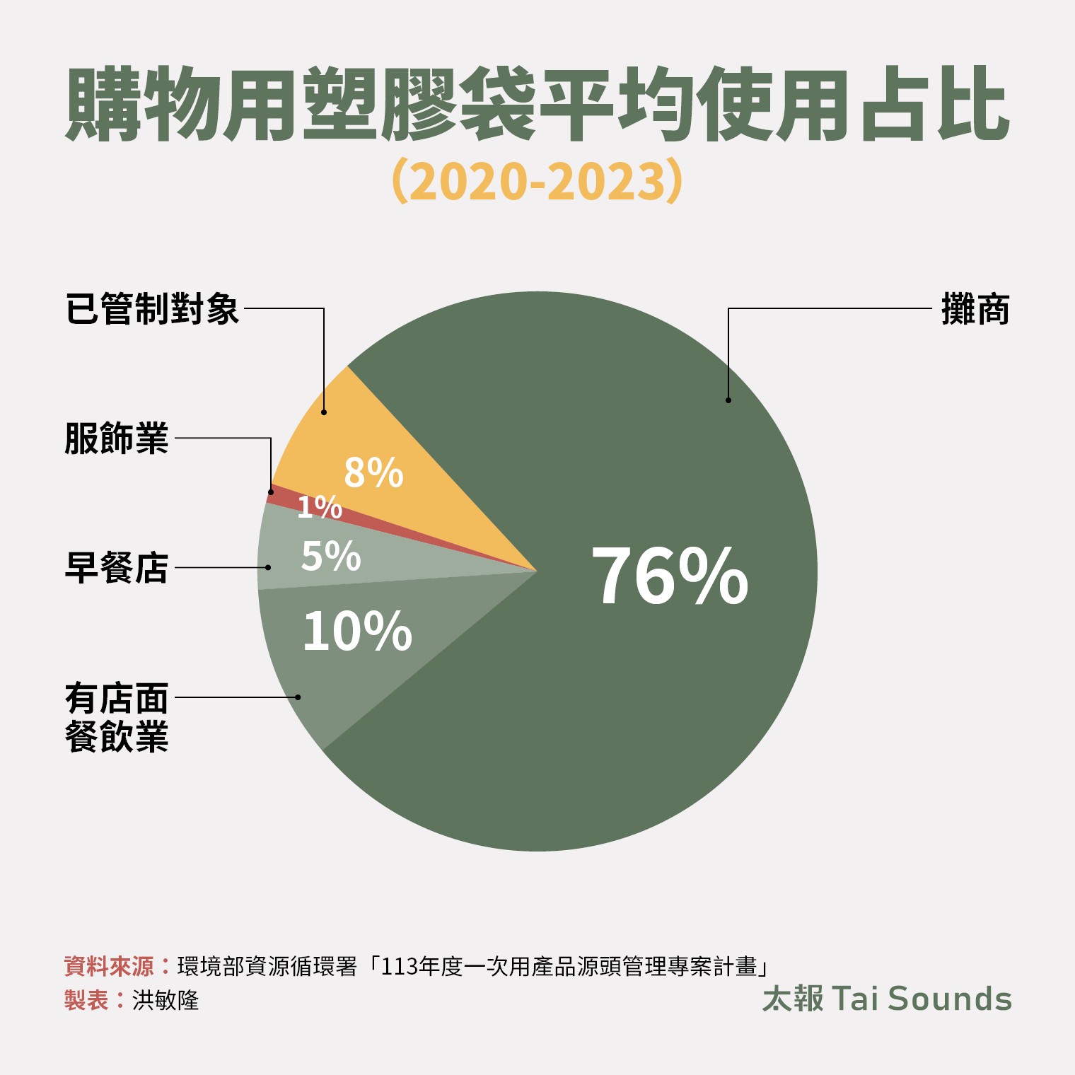 經濟部的統計則揭露另一個警訊,塑膠袋的內銷量持續攀升。2019年的16.9萬公噸,一路爬升至2024年的23.2萬公噸高峰,2025年也維持在22.9萬公噸的高點,顯示整體「減塑」成效,正面臨不進反退的巨大瓶頸。環境部的研究數據指出,台灣塑膠袋用量最大的黑洞,來自非管制的傳統市場及夜市攤商,使用比例高達76%;其次為有店面餐飲業(10%)與早餐店(5%)。環團與學界長年呼籲應將這些場所納入下一波法規管制。