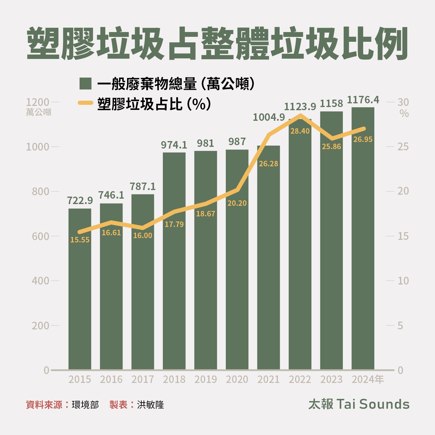 當減塑成效不進反退,直接導致了台灣整體的「垃圾圍城」危機。台灣一般廢棄物總量從2015年的722.9萬公噸,逐年狂飆,2024 年已達到1176.4萬公噸,10年內增加了逾450萬公噸。其中,最難處理的塑膠垃圾佔比,更從 2015年的15.55%,一路攀升至2024年的26.95%。