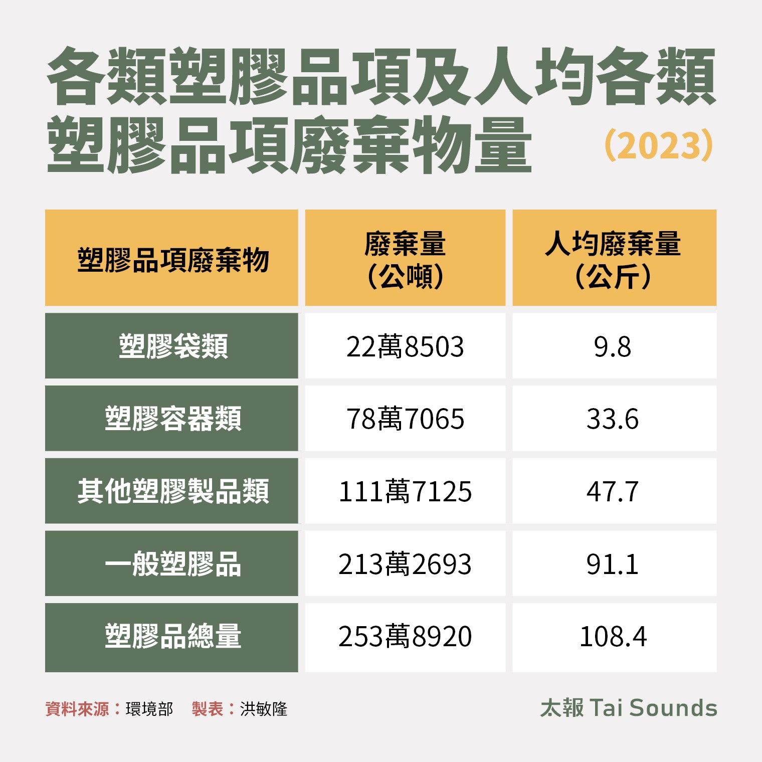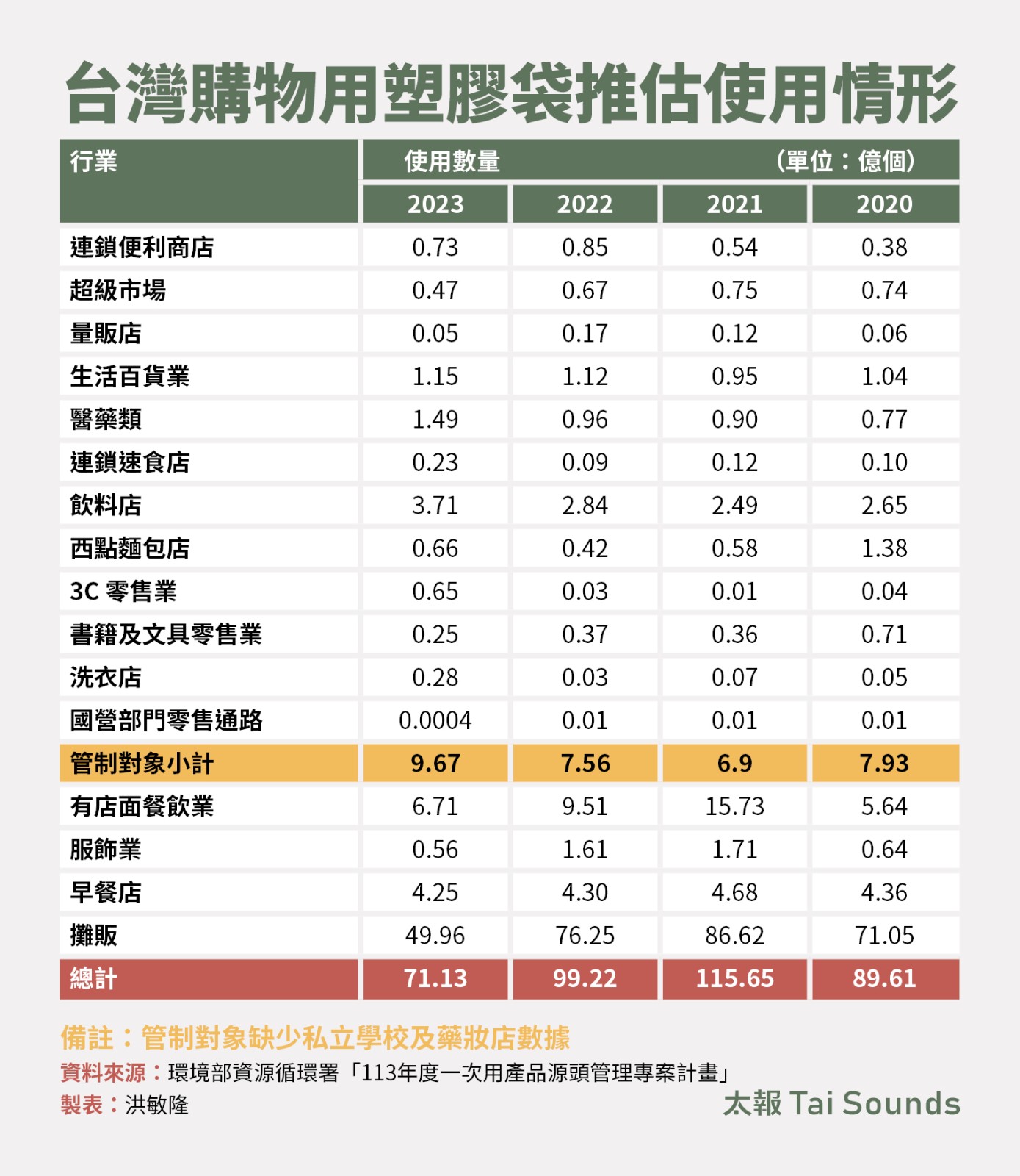 。2023年整體購物用塑膠袋使用量為71.13億個,雖然較疫情期間有減少趨勢,但值得注意的是,「已納入限用管制」的14類對象,其整體使用量竟「不降反升」,成長幅度超過2成。 其中,飲料店的增加量居冠,較前一年暴增8700萬個,達到3.71億個,佔管制對象整體使用量的近4成。