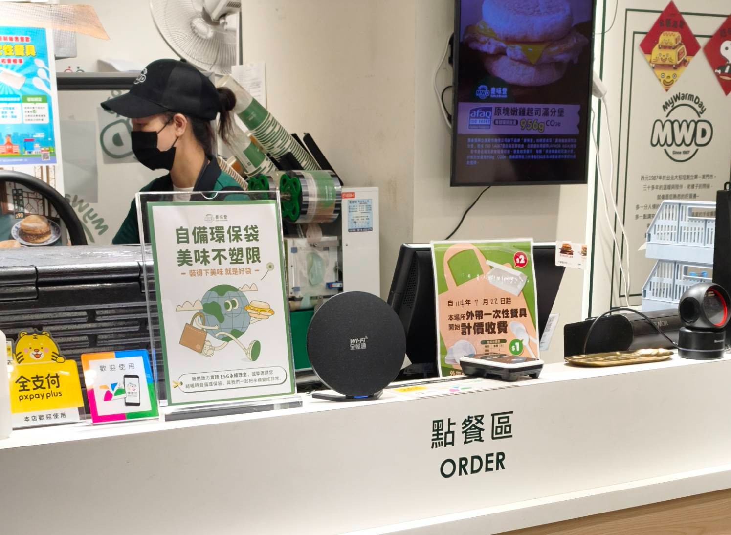 有些店家不再免費提供購物袋,顧客會選擇手拿便當並帶購物袋。環保杯有獎勵金,民眾使用意願也提高。洪敏隆攝