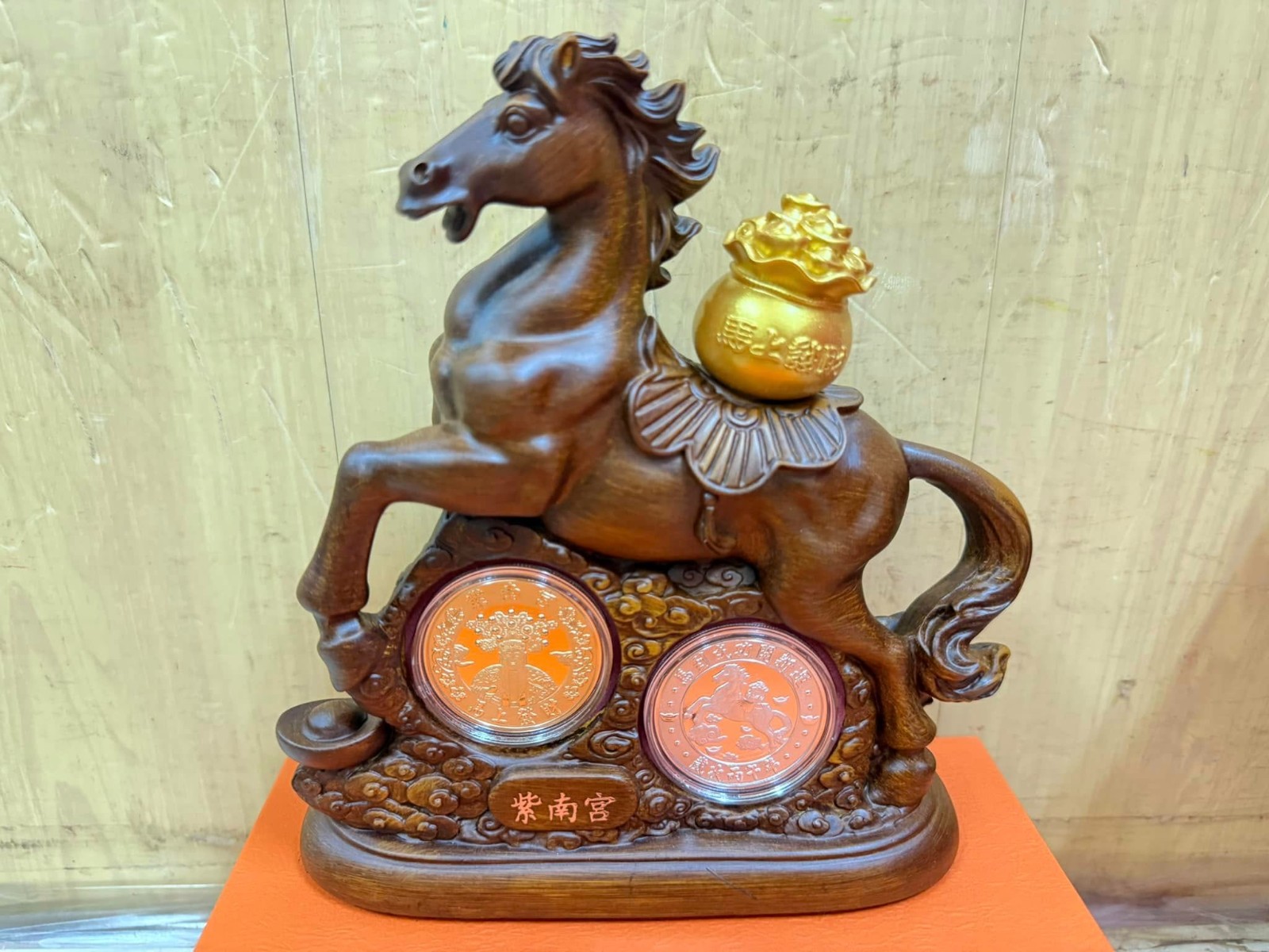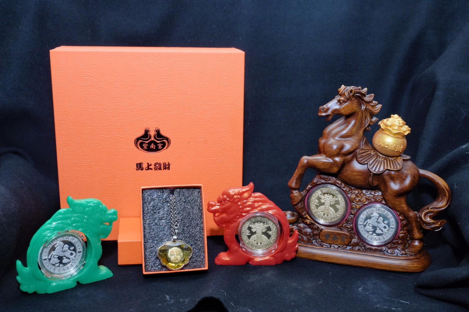 紫南宮丙午馬年錢母,分為單枚金幣、銀幣及精裝金銀套幣,馬年套幣展示座設計為駿馬奔騰,搭配金色聚寶盆,象徵「馬上發財、財運奔騰」,錢母正面為土地公像,背面刻有「馬到成功開新運」字樣。