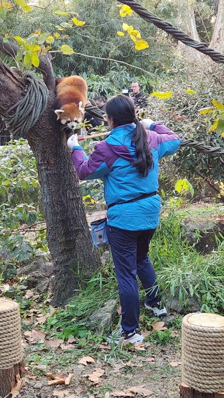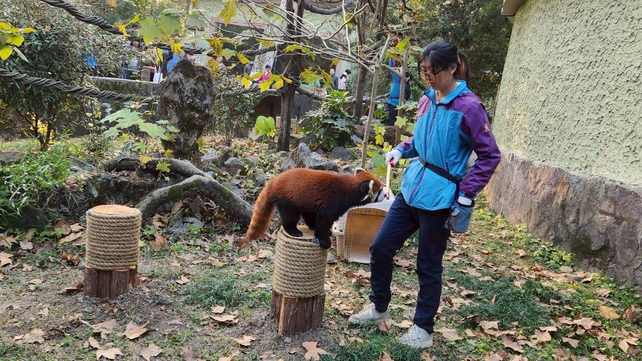 上海動物園將送台北兩隻小貓熊,正由飼養員進行訓練。翻攝自台北市議員秦慧珠臉書