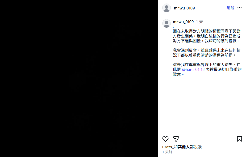 事發後,吳仕群IG頭像換成空白、其他貼文也全刪除,昨(6日)發一篇黑底貼文,承認自己確實犯錯,「因在未取得對方明確的積極同意下與對方發生關係,我明白這樣的行為已造成對方不適與困擾,我深切的感到抱歉。我會深刻反省,並且確保未來在任何情況下都以尊重與清楚的溝通為前提。這是我在尊重與界線上的重大疏失,在此跟對方表達最深切且鄭重的歉意。」