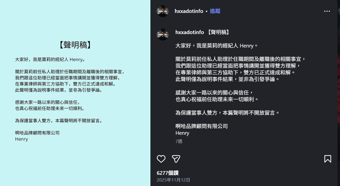 聲明指出,該名助理任職期間發生的詐騙事件已依程序交由司法處理,針對前助理的職務疏失,我們當初基於過往合作關係,於該名助理提出離職時,民國114年11 月 7 日雙方所簽署書面,莫莉已表達不會追究民事責任,由莫莉自己去吸收承擔巨大的金錢損失。該份聲明強調,所有相關的紀錄、資料與文件,都已完整留存,若主管機關需要,也會依法提供。