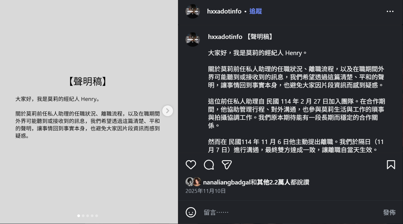 時尚網紅莫莉的經紀人去(2025)年針對助理事件兩度發聲明。取自莫莉助理IG
