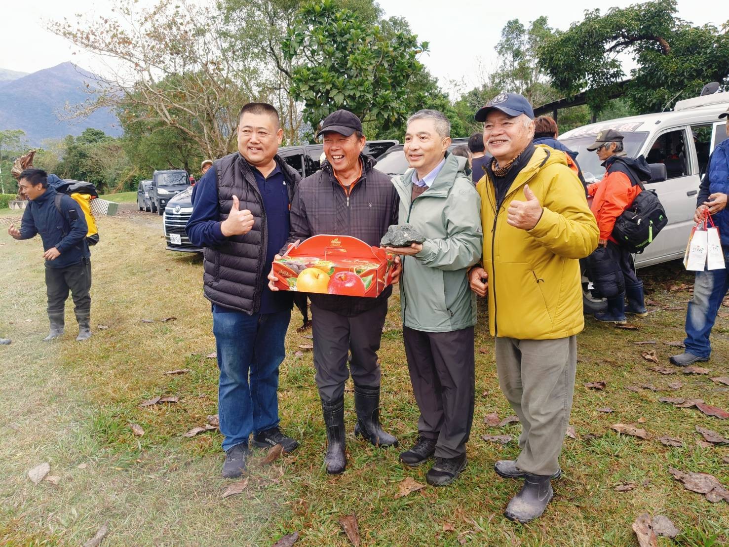 黃群策分署長(右二)致贈蘋果,感謝團隊辛勞、平安歸來。林保署花蓮分署提供