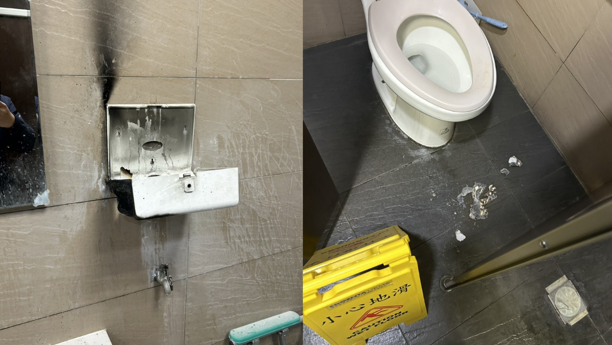 新北市新店區慈濟醫院急診室廁所遭病患縱火,女廁洗手台旁的擦手紙架遭燒毀,男廁的地板上有燒毀的灰燼。讀者提供