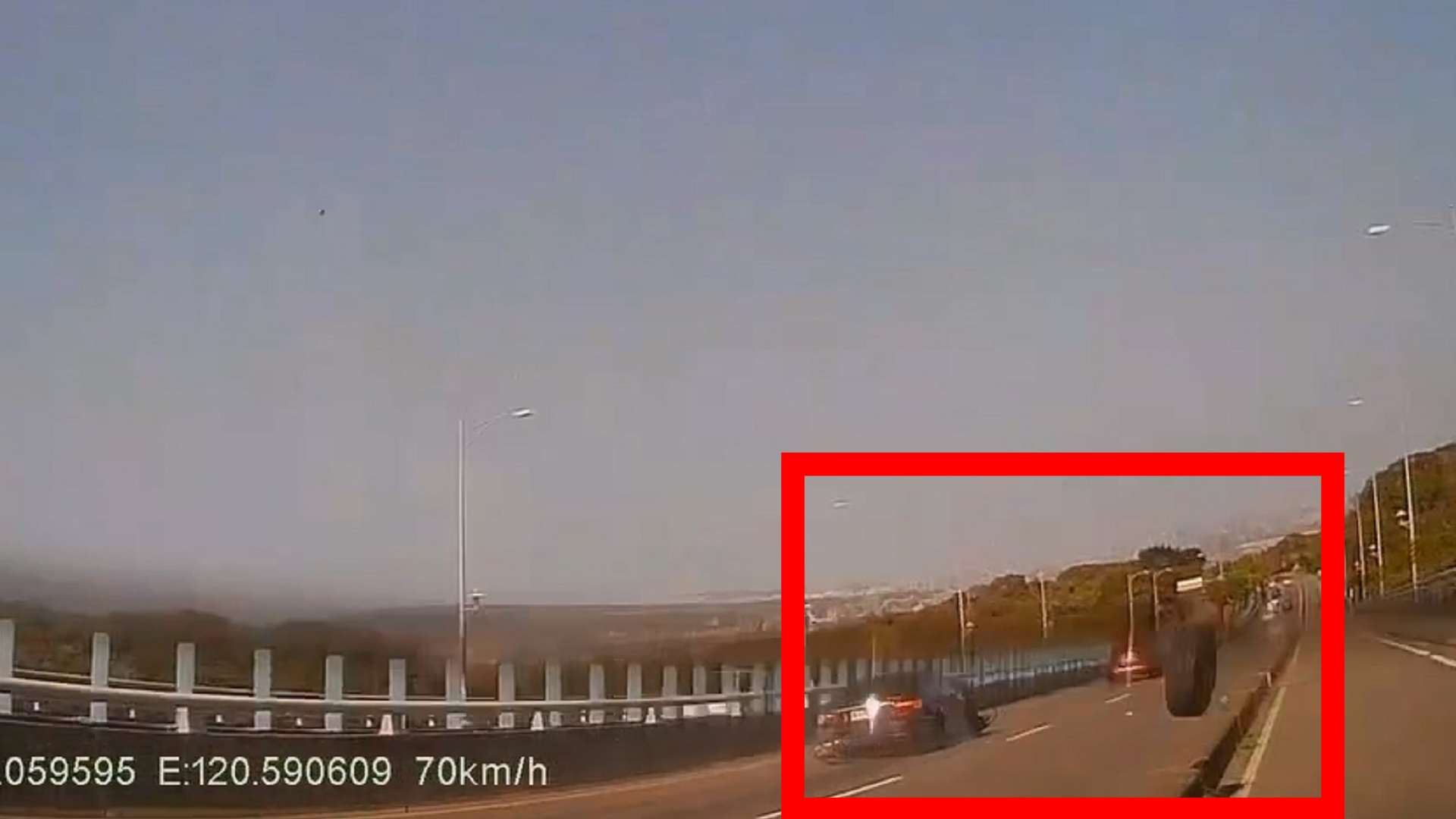 整起車禍發生在10日下午1時48分,休旅車駕駛在行經彰化市74甲線北上往台中方向3.5K處時,遭後方賓士車追撞,休旅車失控跨越快慢車道分隔島。猛烈的撞擊力道,導致賓士車左後輪不翼而飛,在車道上滾動長達2公里。