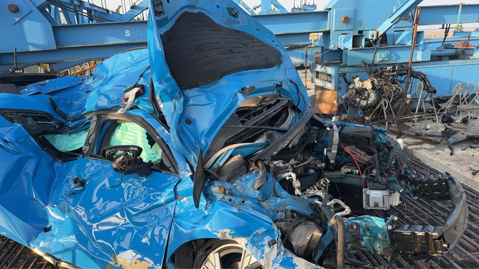 台南市台江大橋23日開工日發生驚悚死亡車禍,1輛藍色奧迪不明原因猛烈撞擊,引擎與車身解體,30歲王姓男駕駛當場死在駕駛座,轄區市警三分局調查肇事原因。