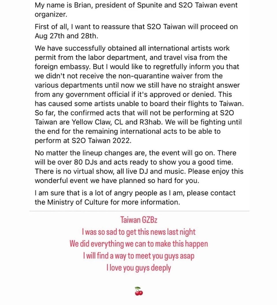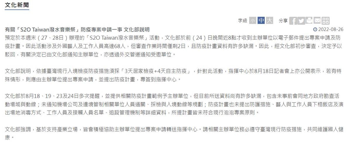 S2O主辦方延遲申請檢疫專案,導致外籍表演者無法順利入境,當時文化部也發布新聞稿解釋。取自文化部