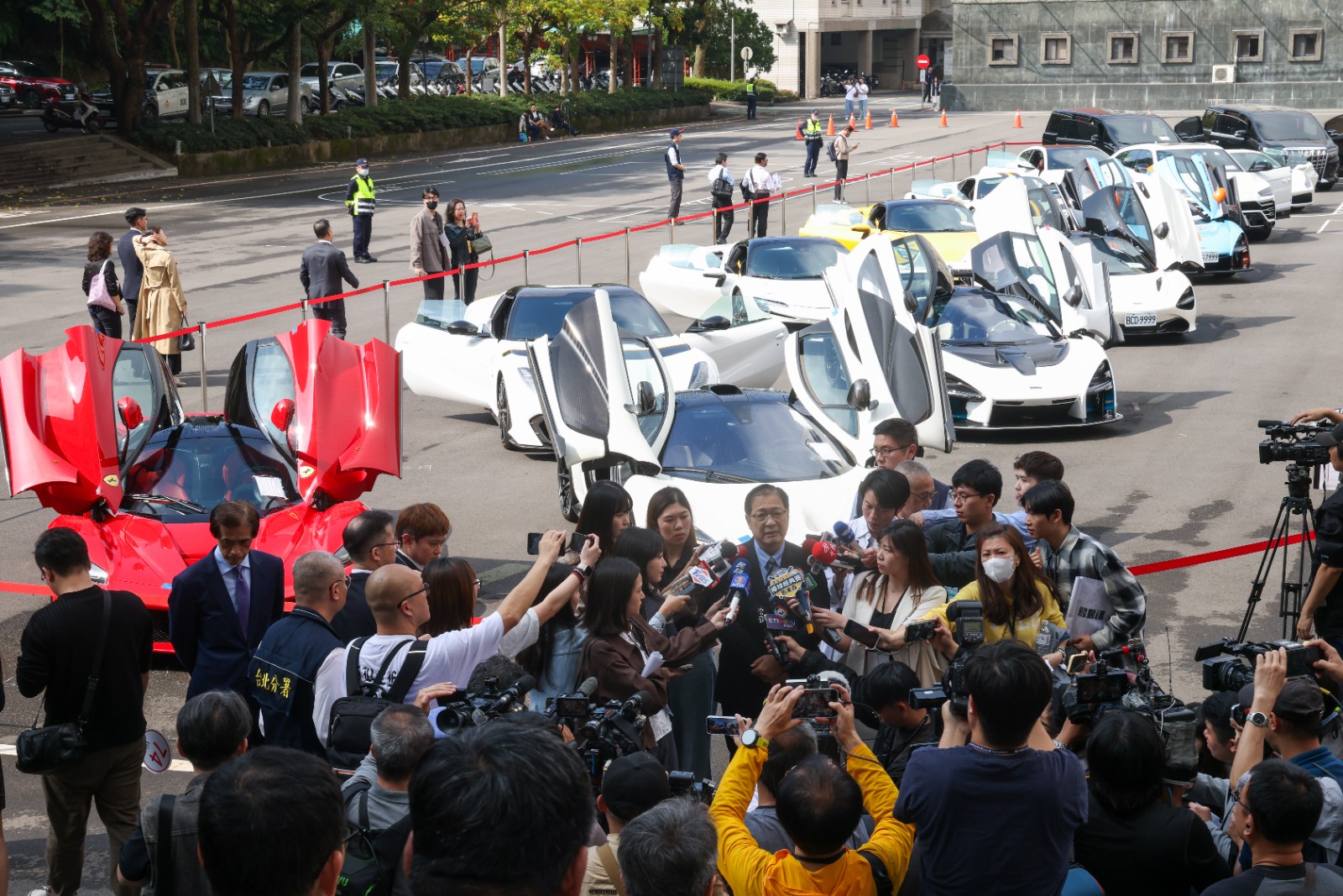 法務部行政執行署台北分署於本月2日舉辦聯合拍賣及打詐宣示活動,現場展示33輛太子集團旗下豪車。廖瑞祥攝
