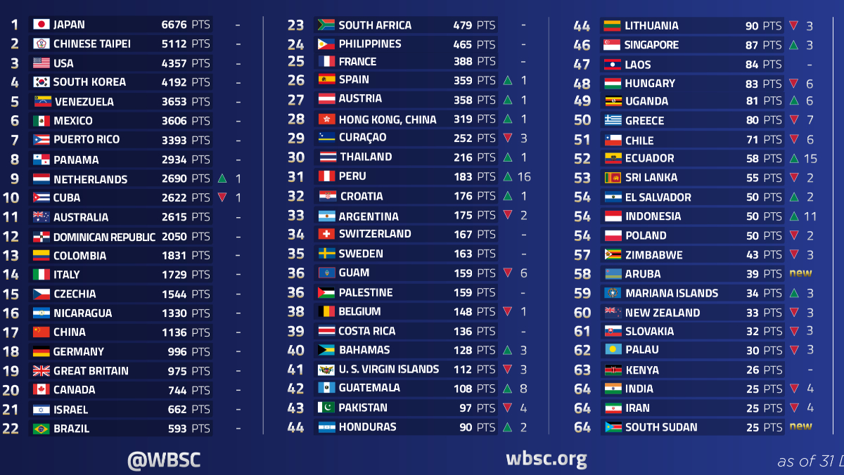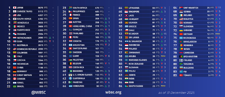 WBSC 在 2025 年最後一天更新最新世界排名,台灣在男子棒球項目中排名維持第 2,日本隊則以 6,676 分蟬聯 WBSC 男子棒球世界排名龍頭。