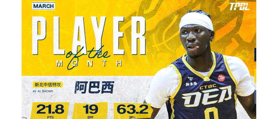台灣職業籃球大聯盟(TPBL)今日公布三月個人獎項得主。新北中信特攻的阿巴西以本土最高效率值與穩定得分表現榮獲三月 MVP;福爾摩沙夢想家的班提爾則以外線火力、禁區威脅及助攻組織影響力,被評選為三月最佳外援。