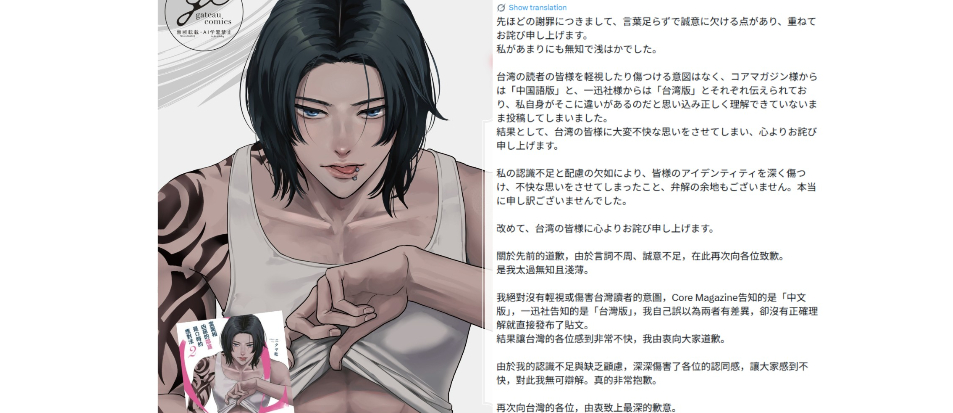日本BL漫畫家「ニクヤ乾」因為將繁體中文版標註五星旗,還稱台灣是「某個國家」遭炎上,即便道歉仍無法止血,原本邀請她明年2月來台參加台北國際動漫節舉行簽名會的青文出版社今天(12/29)宣布,取消所有活動,已購票的讀者全額退款。