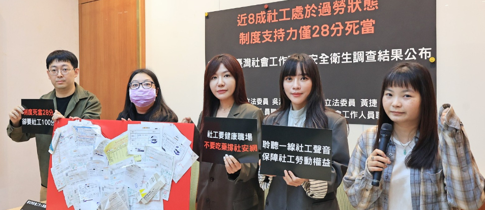 在4月2日「台灣社工日」前夕,台北市社會工作人員職業工會、高雄市社會工作人員職業工會,偕同民進黨立委吳沛憶、黃捷召開記者會,公布「2026年臺灣社會工作職業安全心理衛生調查」,結果顯示近8成第一線社工處於過勞狀態,制度支持力更僅28分,呈現「死當」水準。