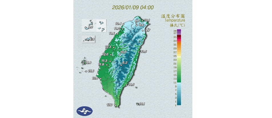 氣象署指出,今日(1/10)輻射冷卻影響,各地清晨仍寒冷,白天氣溫稍回升,中部以北及宜蘭普遍為9至11度,南部及花東為12至15度,局部空曠或近山區河谷氣溫則更低一些,高雄以北及宜、花、金、馬都有10度以下低溫出現的機率,但白天氣溫稍回升,預測北部及宜蘭高溫約19度,中南部及花東為20至23度,西半部日夜溫差大。