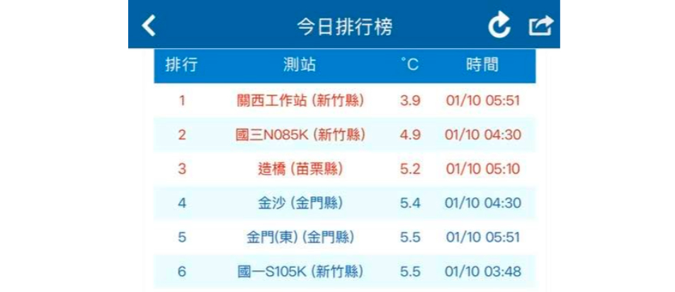 氣象署指出,今日(1/10)輻射冷卻影響,高雄以北及宜、花、金、馬都有10度以下低溫出現的機率,低溫特報並指今上午局部地區有6度以下氣溫發生的機率。前中央氣象局長鄭明典指出,怎麼看輻射冷卻低溫特別在哪裡?冷高壓的直接影響,通常看到的是山上的文大冷吱吱,山下平地會緩一些,這次明顯顛倒過來了。