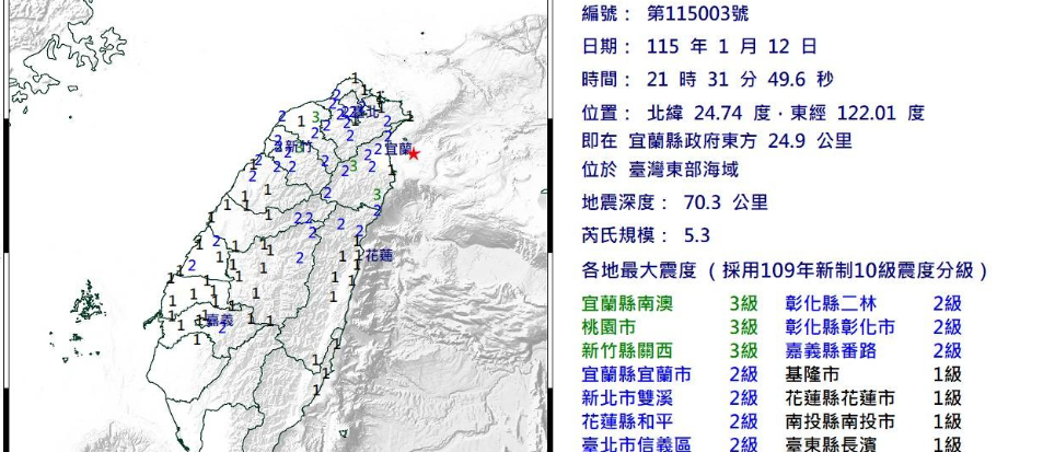 又有地震襲台!全台今天(1/12)晚間感受明顯搖晃。中央氣象署表示,時間為2026年1月12日21:31:49,地震位置是在北緯 24.74度,東經 122.01度,也就是宜蘭縣政府東方 24.9 公里 ,位於台灣東部海域。不少北部民眾都明顯感受震動,雖然震度最大僅3級,仍讓不少人驚呼。