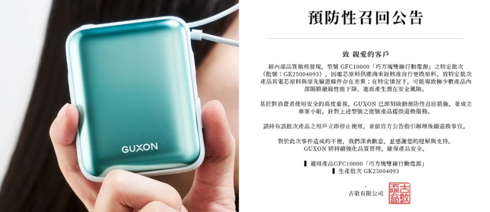 台灣品牌行動電源傳出爆炸事故。有網友指出,近日購入GUXON巧方塊雙線行動電源,用它連接電動桌,竟突然自爆自燃,家裡滿是白煙、自己腳底也被燙傷,幸好人都平安。事件爆光後,GUXON緊急宣布召回特定批號產品,呼籲消費者立即停用