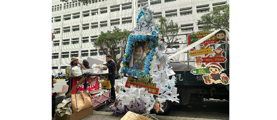 1歲10個月大的男童剴剴在2023年12月24日聖誕夜,慘遭惡保母劉彩萱、劉若琳姊妹虐死,長眠於陽明山花葬公墓。二審今天進行辯論,公訴檢察官馬中人哽咽說,2年前的平安夜,剴剴失去了寶貴的生命….剴剴戰士則手製一份珍貴的禮物「白色聖誕樹」,樹上掛滿卡片充斥對他的思念,大家不約而同祈禱「法院重判兇手,真正守護孩子安全」,這棵樹已送上陽明山。