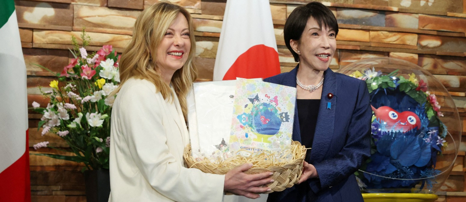 義大利總理梅洛尼訪問日本,16日會見首相高市早苗,兩人舉行會談並共進午餐。高市為前一天歡度49歲生日的梅洛尼送上生日蛋糕,在午宴用義大利語唱生日快樂歌,還送她一籃裝滿三麗鷗週邊商品的大禮包,讓梅洛尼開心不已。