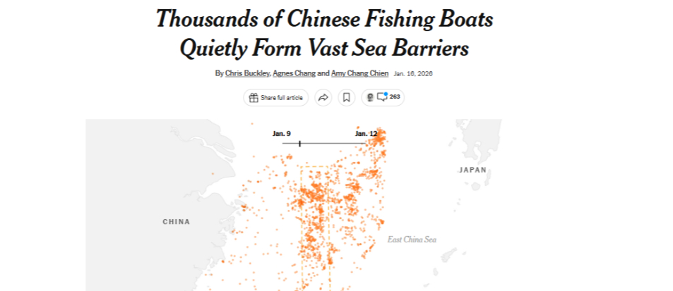 《紐約時報》依據海上船隻定位資料分析報導,中國漁船於去年耶誕節及今年1月11日,兩度在東海大規模進行陣列式聚集,部分貨輪必須繞道行駛。專家認為,這項行動意在演練海上民兵快速聚集,控制爭議性海域。