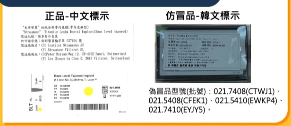 食藥署今(21)日發出新聞稿指出,近期接獲台灣士卓曼醫療器械有限公司通報,有未經該公司授權的通路在國內銷售「史得勞曼純鈦洛新骨內植體(骨高度錐形)(衛部醫器輸字027794號)」許可證之偽冒品,共有四批號流入台灣市面,食藥署已移送檢調,並通知醫療院所注意。