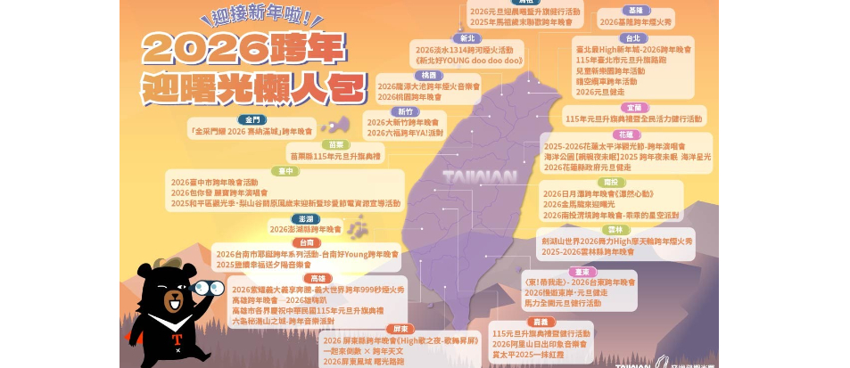 跨年將至,全台各地紛紛推出最具地方特色之賞夕陽、跨年與迎曙光活動,交通部觀光署彙整國家風景區、主題樂園及各個縣市政府等44個特色活動,各地不同風格的跨年體驗,從都會星光派對、山城日出音樂會,到湖畔跨年與戰地曙光,邀請全國民眾跟著旅遊地圖,一起迎接嶄新的2026年!
